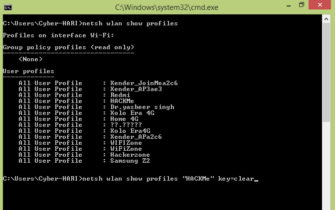 4.- Now type ‘netsh wlan show profile “profilename” key=clear’ and hit enter